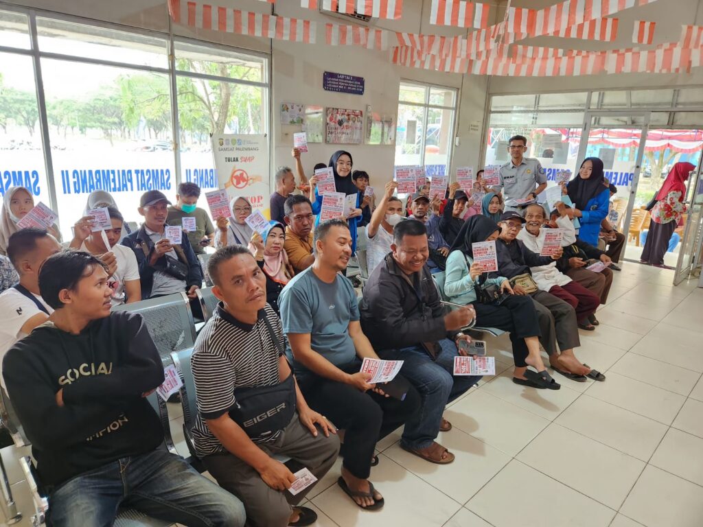 Palembang – Dalam upaya menyebarkan informasi terkait manfaat dari pembayaran pajak kendaraan bermotor dan program-keringanan pajak kendaran yang saat ini sedang berlangsung di wilayah Sumatera Selatan. Jasa Raharja Cabang Sumsel yang dalam hal ini diwakilkan PJ Samsat Palembang II Bambang Irwansyah Bersama Team Samsat Palembang II pada Rabu, 25 September 2024 melakukan sosialisai terkait program pemutihan pajak kendaraan bermotor yang saat ini sedang berlangsung di wilayah Sumsel kepada para masyarakat di Samsat Palembang II